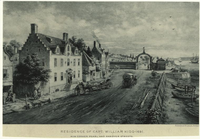 “In 1695 Lord Bellamont was appointed, but did not assume authority until nearly three years afterward, during which time piracy reigned supreme upon the ocean, and anarchy and poverty again invaded the city. When he did arrive, the British Government was implored to furnish a naval force to scour the seas and exterminate piracy, but a war with France was then in progress and all its vessels were needed for the coast defense of England. Governor Bellamont finally organized a stock company which fitted out a privateering expedition, consisting of five ships, carrying sixty men and thirty guns, entrusting the command to one Captain William Kidd, who had been recommended by some of the most eminent citizens, Robert Livingston among others. Kidd had a wife and child, resided in Liberty Street, and was regarded as capable and conscientious. His history is well known, having soon turned pirate himself and for two years continued upon a course of plunders and outrages that made all former offenders appear innocent by comparison. When it became apparent that there were few ships left to burn and plunder, he steered homeward, landing on Gardiner’s Island, where he is alleged to have buried most of his treasure, and proceeded to Boston, where he engaged in business under an assumed name, leaving his wife and child still in New York. He was at last discovered, arrested, sent to England for trial, found guilty, and hung upon May 12, 1701.”